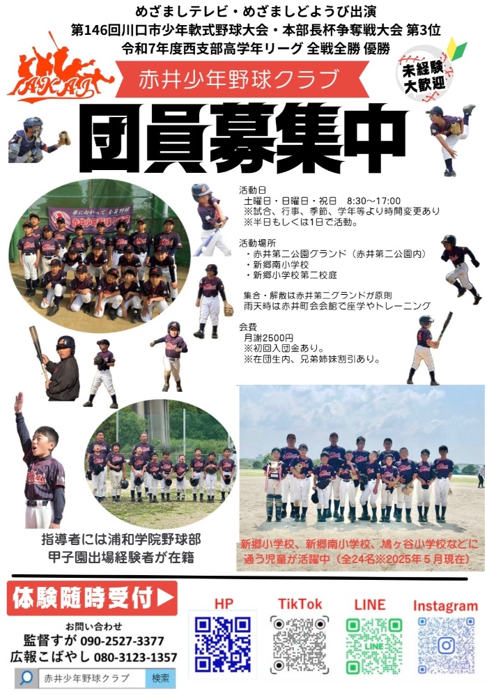 ・令和7年度西支部高学年リーグ戦にて全勝により優勝。これにより第147回川口市少年軟式野球大会・支部代表選抜大会に出場。